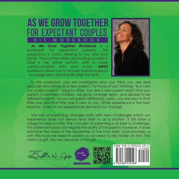 As We Grow Together Workbook is a workbook for expectant parents. This pregnancy is God’s blessing to you and your family. This is a time when reconciling yourself to God is the prime activity, with a closer communication with your mate. AWGT workbook allows you to answer questions about your pregnancy and the life after the birth. In this workbook, you will investigate who you think you are and discover who will be as a new parent. For those of you thinking: "but I am not a new parent." I beg to differ. You are a new parent each time you parent. In between children, we grow, change, learn, and decide to be different parents. So you will parent differently. Lastly, you are new to that little one and that little one is new to you. While experience is the best teacher, more of our experiences demand our change. The role of parenting changes daily with new challenges which our experience does not always lend itself to as a solution. It still takes a village to raise a child. The concept of parenting is at best a challenge. This statement does not negate the ability of the parent, however, it does reinforce the need of the leadership of the Holy Spirit. God provides us with the tools we need to parent so we need to rely totally on Him. The child is a gift. We are stewards of the gift.