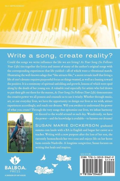 Write a song, create reality? Could the songs we write influence the life we are living? As Your Song (So Follows Your Life) ties together the lyrics and intent of many of the author's original songs with the corresponding experiences that life yielded-all of which were a vibrational match. Illustrating the well-known adage that "like attracts like," a secret reveals itself that living a life of one's dreams requires purposeful focus on things wanted, as well as a leaning toward the positive. It is a testimony of spiritual unfolding and growth, lessons of which were sped along by the death of her young son. A valuable read especially for artists who feel drawn to put their gift out there for the masses, As Your Song (So Follows Your Life) demonstrates the creative power we all possess and counsels us to use it wisely. Whether through music, art, or our everyday lives, we have the opportunity to design our lives as we wish, attract experiences accordingly, and reach our dreams. Will you awaken to understand the power of what you create? Through the very songs that epitomize our lives, we infuse harmony or discord to the world around us each day. Wondrously, we have the power-and the knowledge is available-to harness our dreams!