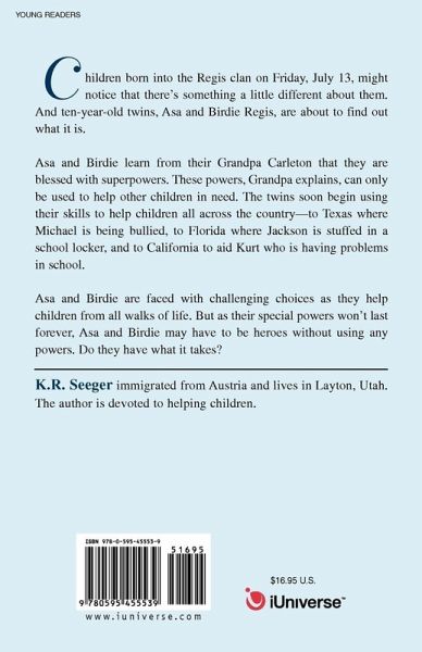 Children born into the Regis clan on Friday, July 13, might notice that there's something a little different about them. And ten-year-old twins, Asa and Birdie Regis, are about to find out what it is. Asa and Birdie learn from their Grandpa Carleton that they are blessed with superpowers. These powers, Grandpa explains, can only be used to help other children in need. The twins soon begin using their skills to help children all across the country-to Texas where Michael is being bullied, to Florida where Jackson is stuffed in a school locker, and to California to aid Kurt who is having problems in school. Asa and Birdie are faced with challenging choices as they help children from all walks of life. But as their special powers won't last forever, Asa and Birdie may have to be heroes without using any powers. Do they have what it takes?