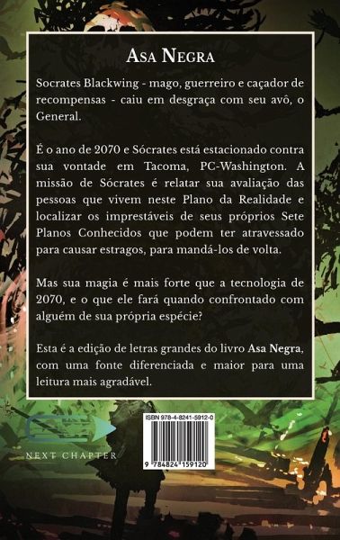 Socrates Blackwing - mago, guerreiro e caçador de recompensas - caiu em desgraça com seu avô, o General. É o ano de 2070 e Sócrates está estacionado contra sua vontade em Tacoma, PC-Washington. A missão de Sócrates é relatar sua avaliação das pessoas que vivem neste Plano da Realidade e localizar os imprestáveis de seus próprios Sete Planos Conhecidos que podem ter atravessado para causar estragos, para mandá-los de volta. Mas sua magia é mais forte que a tecnologia de 2070, e o que ele fará quando confrontado com alguém de sua própria espécie? Esta é a edição de letras grandes do livro Asa Negra, com uma fonte diferenciada e maior para uma leitura mais agradável.