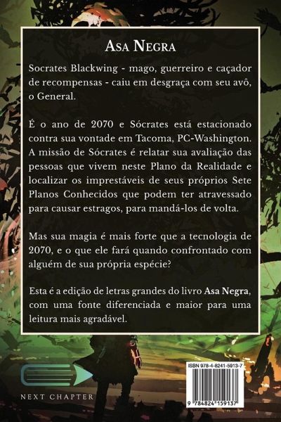 Socrates Blackwing - mago, guerreiro e caçador de recompensas - caiu em desgraça com seu avô, o General. É o ano de 2070 e Sócrates está estacionado contra sua vontade em Tacoma, PC-Washington. A missão de Sócrates é relatar sua avaliação das pessoas que vivem neste Plano da Realidade e localizar os imprestáveis de seus próprios Sete Planos Conhecidos que podem ter atravessado para causar estragos, para mandá-los de volta. Mas sua magia é mais forte que a tecnologia de 2070, e o que ele fará quando confrontado com alguém de sua própria espécie? Esta é a edição de letras grandes do livro Asa Negra, com uma fonte diferenciada e maior para uma leitura mais agradável.