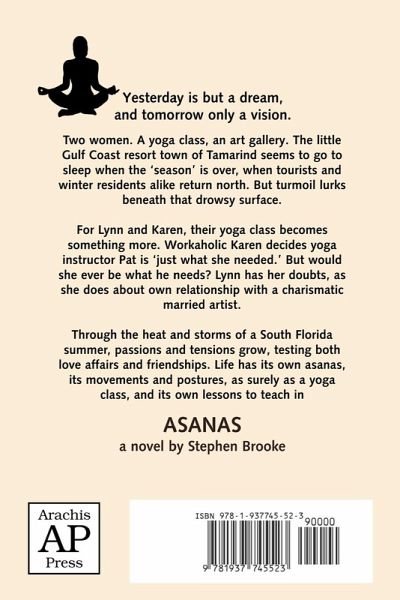 "Yesterday is but a dream, and tomorrow only a vision." Two women. A yoga class, an art gallery. The little Gulf Coast resort town of Tamarind seems to go to sleep when the 'season' is over, when tourists and winter residents alike return north. But turmoil lurks beneath that drowsy surface. For Lynn and Karen, their yoga class becomes something more. Workaholic Karen decides yoga instructor Pat is 'just what she needed.' But would she ever be what he needs? Lynn has her doubts, as she does about own relationship with a charismatic married artist. Through the heat and storms of a South Florida summer, passions and tensions grow, testing both love affairs and friendships. Life has its own asanas, its movements and postures, as surely as a yoga class, and its own lessons to teach in ASANAS, a novel by Stephen Brooke.