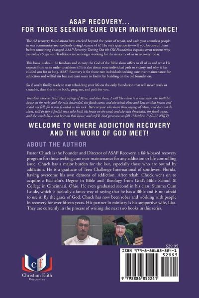 Asap Recovery--for Those Seeking Cure over Maintenance! The old recovery foundations have cracked beyond the point of repair, and each year countless people in our community are needlessly dying because of it! The only question is--will you be one of them before something changes? ASAP Recovery: Tearing out the Old Foundation exposes seven reasons why yesterday's Steps and Traditions are no longer working for the majority of us in recovery today. This book is about the freedom and victory the God of the Bible alone offers to all of us and what He expects from us in order to achieve it! It is also about your individual path to victory and why it has eluded you for so long. ASAP Recovery is for those rare individuals seeking cure over maintenance for addiction and willful sin but just can't seem to find it by building on the old foundation. So if you're finally ready to start rebuilding your life on the only foundation that will never crack or crumble, then this is the book, program, and path for you. Therefore whoever hears these sayings of Mine, and does them, I will liken him to a wise man who built his house on the rock: and the rain descended, the floods came, and the winds blew and beat on that house; and it did not fall, for it was founded on the rock. But everyone who hears these sayings of Mine, and does not do them, will be like a foolish man who built his house on the sand: and the rain descended, the floods came, and the winds blew and beat on that house; and it fell. And great was its fall. (Matthew 7:24-27 NJKV) Welcome to Where Addiction Recovery and the Word of God Meet!