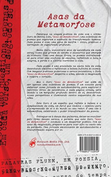 In "Asas da Metamorfose," Betina Lobo takes readers on a fascinating journey through the intricacies of human existence. Through her collection of poems, Lobo explores themes of reflection, growth, and the profound changes that shape our lives. Each poem serves as a window into the enigma of human emotions, offering insights into the complexities of sentiment, the passage of time, and the universal quest for meaning. From the quiet moments of introspection to the fiery crucibles of change, Lobo's words resonate with the timeless truths that define our shared humanity. Throughout "Asas da Metamorfose," Lobo celebrates the resilience of the human spirit and the inherent capacity for growth and transformation. Her poetry serves as a poignant reminder that, like the wings of a butterfly, we possess the ability to rise above adversity and embrace the fullness of our being. Through eloquent verses and evocative imagery, Lobo invites readers to embark on a journey of self-discovery and renewal. "Asas da Metamorfose" is not just a collection of poems but a profound meditation on the beauty of change and the endless possibilities that await those willing to embrace it.