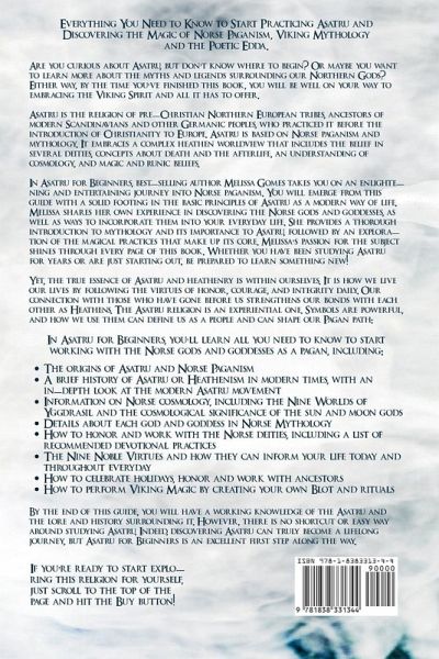 Everything You Need to Know to Start Practicing Asatru and Discovering the Magic of Norse Paganism, Viking Mythology and the Poetic Edda. Are you curious about Asatru, but don't know where to begin? Or maybe you want to learn more about the myths and legends surrounding our Northern Gods? Either way, by the time you've finished this book, you will be well on your way to embracing the Viking Spirit and all it has to offer. Asatru is the religion of pre-Christian Northern European tribes, ancestors of modern Scandinavians and other Germanic peoples, who practiced it before the introduction of Christianity to Europe. Asatru is based on Norse paganism and mythology. It embraces a complex heathen worldview that includes the belief in several deities, concepts about death and the afterlife, an understanding of cosmology, and magic and runic beliefs. In Asatru for Beginners, best-selling author Melissa Gomes takes you on an enlightening and entertaining journey into Norse paganism. You will emerge from this guide with a solid footing in the basic principles of Asatru as a modern way of life. Melissa shares her own experience in discovering the Norse gods and goddesses, as well as ways to incorporate them into your everyday life. She provides a thorough introduction to mythology and its importance to Asatru, followed by an exploration of the magical practices that make up its core. Melissa's passion for the subject shines through every page of this book. Whether you have been studying Asatru for years or are just starting out, be prepared to learn something new! Yet, the true essence of Asatru and heathenry is within ourselves. It is how we live our lives - by following the virtues of honor, courage, and integrity daily. Our connection with those who have gone before us strengthens our bonds with each other as Heathens. The Asatru religion is an experiential one. Symbols are powerful, and how we use them can define us as a people and can shape our Pagan path: In Asatru for Beginners, you'll learn all you need to know to start working with the Norse gods and goddesses as a pagan, including:The origins of Asatru and Norse Paganism A brief history of Asatru or Heathenism in modern times, with an in-depth look at the modern Asatru movement Information on Norse cosmology, including the Nine Worlds of Yggdrasil and the cosmological significance of the sun and moon gods Details about each god and goddess in Norse Mythology How to honor and work with the Norse deities, including a list of recommended devotional practices The Nine Noble Virtues and how they can inform your life today and throughout everyday How to celebrate holidays, honor and work with ancestors How to perform Viking Magic by creating your own Blot and rituals By the end of this guide, you will have a working knowledge of the Asatru and the lore and history surrounding it. However, there is no shortcut or easy way around studying Asatru. Indeed, discovering Asatru can truly become a lifelong journey, but Asatru for Beginners is an excellent first step along the way. Inside the book, you will also find three bonuses for you, go check them out! If you're ready to start exploring this religion for yourself, just scroll to the top of the page and hit the Buy button!