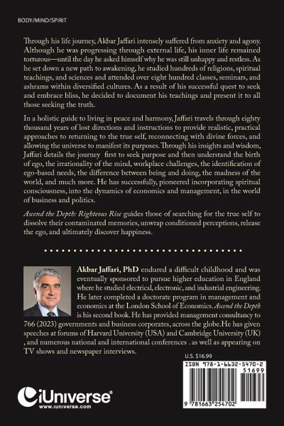 All the way through his life journey, Akbar Jaffari intensely suffered from anxiety and agony. Although he was progressing through external life, his inner life remained torturous-until the day he asked himself why he was still unhappy and restless. As he set down a new path to awakening, he studied hundreds of religions and sciences and attended over eight hundred classes, seminars, and ashrams within diversified cultures. As a result of his successful quest to seek and embrace bliss, he decided to document his teachings and present it to all those seeking the truth . In a holistic guide to living in peace and harmony, Jaffari travels through eight thousand years of lost directions and instructions to provide realistic, practical approaches to returning to the true self, reconnecting with divine forces, and allowing the universe to manifest its purposes. Through his insights and wisdom, Jaffari details the journey to first seek purpose and then understand the birth of ego, the irrationality of the mind, workplace challenges, the identification of ego-based needs, the difference between being and doing, the madness of the world, and much more. Ascend the Depth: Righteous Rise guides those in search of the true self to dissolve their contaminated memories, unwrap conditioned perceptions, release the ego, and ultimately discover happiness.