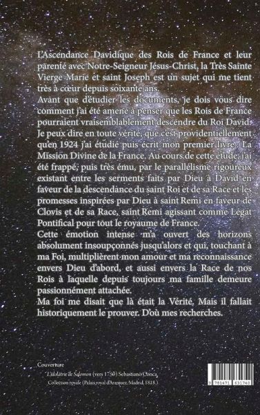Nouvelle édition augmentée d'un portrait de l'auteur, de 2 cartes et 21 illustrations couleurs et du tableau généalogique des ascendances davidiques des Rois de France. ___________ L'Ascendance Davidique des Rois de France et leur parenté avec Notre-Seigneur Jésus-Christ, la Très Sainte Vierge Marie et saint Joseph est un sujet qui me tient très à cur depuis soixante ans. Avant que d'étudier les documents, je dois vous dire comment j'ai été amené à penser que les Rois de France pourraient vraisemblablement descendre du Roi David. Je peux dire en toute vérité, que c'est providentiellement qu'en¿1924 j'ai étudié puis écrit mon premier livre¿: La Mission Divine de la France. Au cours de cette étude, j'ai été frappé, puis très ému, par le parallélisme rigoureux existant entre les serments faits par Dieu à David en faveur de la descendance du saint Roi et de sa Race et les promesses inspirées par Dieu à saint¿Remi en faveur de Clovis et de sa Race, saint¿Remi agissant comme Légat Pontifical pour tout le royaume de France. Cette émotion intense m'a ouvert des horizons absolument insoupçonnés jusqu'alors et qui, touchant à ma Foi, multiplièrent mon amour et ma reconnaissance envers Dieu d'abord, et aussi envers la Race de nos Rois à laquelle depuis toujours ma famille demeure passionnément attachée. Ma foi me disait que là était la Vérité. Mais il fallait historiquement le prouver. D'où mes recherches.