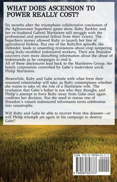 WHAT DOES ASCENSION TO POWER REALLY COST? Six months after the triumphant collaborative conclusion of the AgInnovator Superhero game show, Ruby Barkley and her ex-husband Gabriel Martiniere still struggle with the professional and personal fallout from their victory. The Superhero money allowed Ruby to launch her line of agricultural biobots. But one of the RubyBot spinoffs, the Defender, leads to unsettling revelations about crop tampering using body-modified indentured workers. Their son Brandon uncovers even more disturbing information about the abuse of indentureds as he campaigns to end it. All of these disclosures lead back to the Martiniere Group, the family corporation controlled by Gabe's malevolent uncle, Philip Martiniere. Meanwhile, Ruby and Gabe wrestle with what form their resumed relationship will take, as Ruby contemplates whether she wants to take on the role of a Martiniere wife. The revelation that Gabe's father is not who they thought, and Philip's attempt to force Ruby away from Gabe confirms her decision. But the need to rescue one of Brandon's valued indentured informants turns celebration into catastrophe. Will Ruby and Gabe be able to recover from this disaster-or will Philip triumph yet again in his campaign to destroy Gabe?