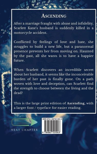 After a marriage fraught with abuse and infidelity, Scarlett Kane's husband is suddenly killed in a motorcycle accident. Conflicted by feelings of love and hate, she struggles to build a new life, but a paranormal presence prevents her from moving on. Haunted by the past, all she wants is to have a happier future. When Scarlett discovers an incredible secret about her husband, it seems like the inconceivable burden of her past is finally gone. On a path woven with love and deception, can Scarlett find the strength to choose between the living and the dead? This is the large print edition of Ascending, with a larger font / typeface for easier reading.