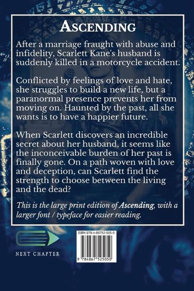 After a marriage fraught with abuse and infidelity, Scarlett Kane's husband is suddenly killed in a motorcycle accident. Conflicted by feelings of love and hate, she struggles to build a new life, but a paranormal presence prevents her from moving on. Haunted by the past, all she wants is to have a happier future. When Scarlett discovers an incredible secret about her husband, it seems like the inconceivable burden of her past is finally gone. On a path woven with love and deception, can Scarlett find the strength to choose between the living and the dead? This is the large print edition of Ascending, with a larger font / typeface for easier reading.