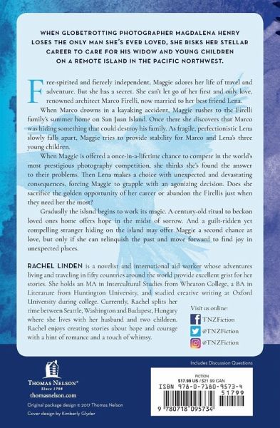 "Winsome kids and family friends add depth and warmth to the well-developed cast of characters. Readers will eagerly await future offerings from this promising new author."--Publishers Weekly, STARRED review "Linden's debut novel is a bittersweet tale of enduring friendship, family ties, and the complexities of love that will engage readers of thoughtful women's fiction."--Library Journal, STARRED review, Debut of the Month When globetrotting photographer Magdalena Henry loses the only man she's ever loved, she risks her stellar career to care for his widow and young children on a remote island in the Pacific Northwest. Free-spirited and fiercely independent, Maggie adores her life of travel and adventure. But she has a secret. She can't let go of her first and only love, renowned architect Marco Firelli, now married to her best friend Lena. When Marco drowns in a kayaking accident, Maggie rushes to the Firelli family's summer home on San Juan Island. Once there she discovers that Marco was hiding something that could destroy his family. As fragile, perfectionistic Lena slowly falls apart, Maggie tries to provide stability for Marco and Lena's three young children. When Maggie is offered a once-in-a-lifetime chance to compete in the world's most prestigious photography competition, she thinks she's found the answer to their problems. Then Lena makes a choice with unexpected and devastating consequences, forcing Maggie to grapple with an agonizing decision. Does she sacrifice the golden opportunity of her career or abandon the Firellis just when they need her the most? Gradually the island begins to work its magic. A century-old ritual to beckon loved ones home offers hope in the midst of sorrow. And a guilt-ridden yet compelling stranger hiding on the island may offer Maggie a second chance at love, but only if she can relinquish the past and move forward to find joy in unexpected places.