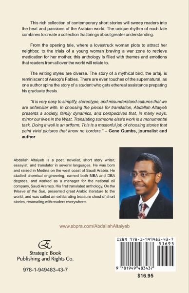 This rich collection of contemporary short stories will sweep readers into the heat and passions of the Arabian world. The unique rhythm of each tale combines to create a collection that brings about greater understanding. From the opening tale, where a lovestruck woman plots to attract her neighbor, to the trials of a young woman braving a war zone to retrieve medication for her mother, this anthology is filled with themes and emotions that readers from all over the world will relate to. The writing styles are diverse. The story of a mythical bird, the arfaj, is reminiscent of Aesop's Fables. There are even touches of the supernatural, as one author spins the story of a student who gets ethereal assistance preparing his graduate thesis. "It is very easy to simplify, stereotype, and misunderstand cultures that we are unfamiliar with. In choosing the pieces for translation, Abdallah Altaiyeb presents a society, family dynamics, and perspectives that, in many ways, mirror our lives in the West. Translating someone else's work is a monumental task. Doing it well is an artform. This is a masterful job of choosing stories that paint vivid pictures that know no borders." - Gene Gumbs, journalist and author About the Author: Abdallah Altaiyeb is a poet, novelist, short story writer, essayist, and translator in several languages. He was born and raised in Medina on the west coast of Saudi Arabia. He studied chemical engineering, earned both MBA and DBA degrees, and worked as a manager for the national oil company, Saudi Aramco. His first translated anthology, On the Weave of the Sun, presented great Arabic literature to the world, and was called an exhilarating treasure chest of short stories, resonating with readers everywhere.