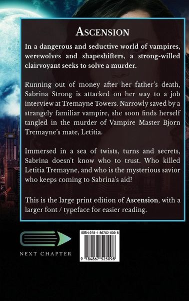In a dangerous and seductive world of vampires, werewolves and shapeshifters, a strong-willed clairvoyant seeks to solve a murder. Running out of money after her father's death, Sabrina Strong is attacked on her way to a job interview at Tremayne Towers. Narrowly saved by a strangely familiar vampire, she soon finds herself tangled in the murder of Vampire Master Bjorn Tremayne's mate, Letitia. Immersed in a sea of twists, turns and secrets, Sabrina doesn't know who to trust. Who killed Letitia Tremayne, and who is the mysterious savior who keeps coming to Sabrina's aid? This is the large print edition of Ascension, with a larger font / typeface for easier reading.