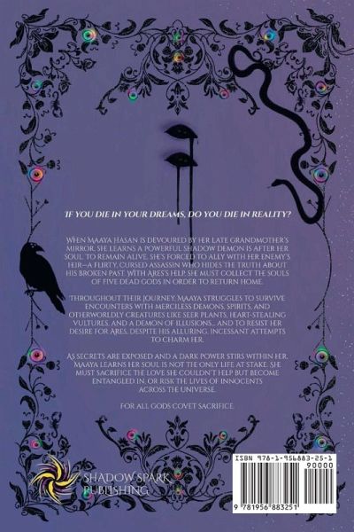 If you die in your dreams, do you die in reality? When Maaya Hasan is devoured by her late grandmother's mirror, she learns a powerful shadow demon is after her soul. To remain alive, she's forced to ally with her enemy's heir-a flirty, cursed assassin who hides the truth about his broken past. With Ares's help, she must collect the souls of five dead gods in order to return home. Throughout their journey, Maaya struggles to survive encounters with merciless demons, spirits, and otherworldly creatures like seer plants, heart-stealing vultures, and a demon of illusions... and to resist her desire for Ares, despite his alluring, incessant attempts to charm her. As secrets are exposed and a dark power stirs within her, Maaya learns her soul is not the only life at stake. She must sacrifice the love she couldn't help but become entangled in, or risk the lives of innocents across the universe. For all gods covet sacrifice. *This edition includes an exclusive bonus chapter*