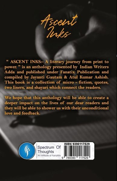"" ASCENT INKS:- A literary journey from print to power. "" is an anthology presented by Indian Writers Adda and published under Fanatix Publication and compiled by Jayanti Gautam & Atul Kumar Ashish. This book is a collection of micro - fiction, quotes, two liners, and shayari which connect the readers. We hope that this anthology will be able to create a deeper impact on the lives of our dear readers and they will be able to shower us with their unconditional love and feedback.