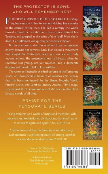 Prepare yourself for The Ascent to Godhood, the fourth book in Neon Yang's silkpunk Tensorate series, a wide-ranging, imaginative, engaging playground that the New York Times lauded as "joyously wild." Finalist for the 2020 Locus Award The Protector is dead. For fifty years, the Protector ruled, reshaping her country in her image and driving her enemies to the corners of the map. For half a century the world turned around her as she built her armies, trained her Tensors, and grasped at the reins of fate itself. Now she is dead. Her followers will quiver, her enemies rejoice. But in one tavern, deep in rebel territory, her greatest enemy drowns her sorrows. Lady Han raised a movement that sought the Protector's head, yet now she can only mourn her loss. She remembers how it all began, when the Protector was young, not yet crowned, and a desperate dancing girl dared to fall in love with her.