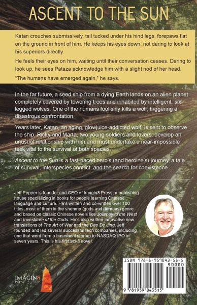 In the far future, a seed ship from a dying Earth lands on an alien planet completely covered by towering trees and inhabited by intelligent, six-legged wolves. Katan, an aging, glowjuice-addicted wolf, is sent to observe the ship. Seven humans emerge, triggering a deadly confrontation. Ricky and Marta, two young soldiers and lovers, develop an unusual relationship with Katan and must undertake a near-impossible task vital to the survival of both species. Ascent to the Sun is a fast-paced hero's (and heroine's) journey, a tale of survival, interspecies conflict, and the search for coexistence.