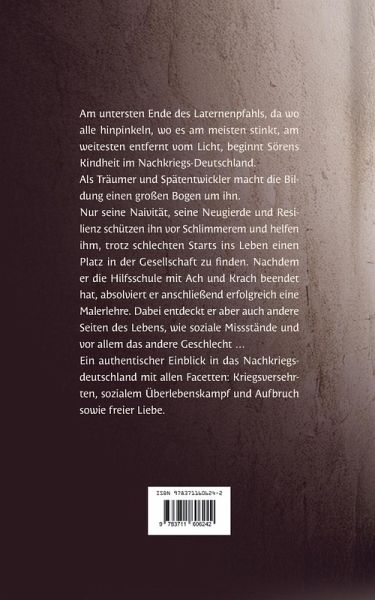 Am untersten Ende des Laternenpfahls, da wo alle hinpinkeln, wo es am meisten stinkt, am weitesten entfernt vom Licht, beginnt Sörens Kindheit im Nachkriegs-Deutschland.Als Träumer und Spätentwickler macht die Bildung einen großen Bogen um ihn.Nur seine Naivität, seine Neugierde und Resilienz schützen ihn vor Schlimmerem und helfen ihm, trotz schlechten Starts ins Leben einen Platz in der Gesellschaft zu finden. Nachdem er die Hilfsschule mit Ach und Krach beendet hat, absolviert er anschließend erfolgreich eine Malerlehre. Dabei entdeckt er aber auch andere Seiten des Lebens, wie soziale Missstände und vor allem das andere Geschlecht ...Ein authentischer Einblick in das Nachkriegsdeutschland mit allen Facetten: Kriegsversehrten, sozialem Überlebenskampf und Aufbruch sowie freier Liebe.