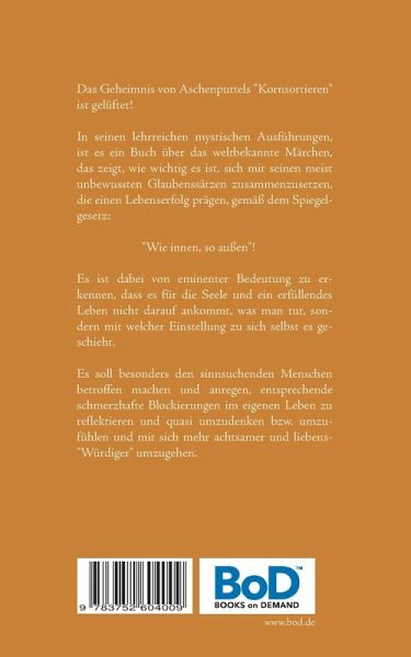 Das Geheimnis von Aschenputtels "Kornsortieren"ist gelüftet!In seinen lehrreichen mystischen Ausführungen, ist es ein Buch über das weltbekannte Märchen, das zeigt, wie wichtig es ist, sich mit seinen meist unbewussten Glaubenssätzen zusammen-zusetzen, die einen Lebenserfolg prägen gemäß dem Spiegel-gesetz: "Wie innen, so außen"!Es ist dabei von eminenter Bedeutung zu erkennen, dass es für die Seele und ein erfüllendes Leben nicht darauf ankommt, was man tut, sondern mit welcher Einstellung zu sich selbst esgeschieht. Es soll besonders den sinnsuchenden Menschen betroffen machen und anregen, entsprechende Hamsterrad-blockierungen im eigenen Leben zu reflektieren und quasi umzudenken bzw. umzufühlen und mit sich achtsamer und liebenswürdiger umzugehen.Fühle es: Du brauchst es dir nicht verdienen und kannst es auch gar nicht verdienen und es aber dennoch erhältst, weil oder wenn du dich mehr und mehr liebst!