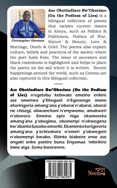 Ase Obotindiaro Bw'Oborimo (On the Podium of Lies) is a bilingual collection of poems that tackles current issues in Kenya, such as Politics and politicians, Politics of War, Nature and beauty, Love and marriage, Death and grief. The poems also explore the culture, beliefs and practices of the society where the poet hails from. The issue of ancestors and black-rootedness is highlighted and helps to place the poetry on the soil where it is written. Recent happenings around the world, such as Corona are also captured in this bilingual collection.***** Ase Obotindiaro Bw'Oborimo (On the Podium of Lies) n'egetabu kebwate emeino erikire ase emenwa y'Ekegusii n'Egesongo mono ekoringoria amang'ana y'oborai n'abarai, oborai ne chisegi, obwanchani n'enywomo, amakweri n'obororo. Emeino eyio nigo ekomoreka amang'ana y'obogima, obomenyi n'okwegena kw'abanto basobo omoriki. Ekamenta korigereria amang'ana y'echisokoro n'emeri y'obwegeni n'obomenyi bwabo. Ebinto biabeire ense ase engaki enke yaetire buna Enyamaa 'mbirikire imee aiga. Soma bwerorere.