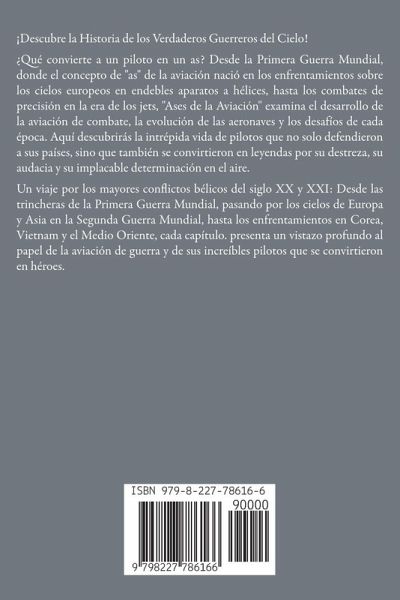 ¡Descubre la Historia de los Verdaderos Guerreros del Cielo! Estimado lector: ¿Te apasiona la historia de la aviación, los relatos de valentía y las hazañas de quienes defendieron el cielo en las guerras más intensas de nuestra historia? "Ases de la Aviación" es el libro que te permitirá volar a través de los conflictos bélicos más emblemáticos desde 1914, de la mano de los pilotos más destacados de todos los tiempos. ¿Qué convierte a un piloto en un as? Desde la Primera Guerra Mundial, donde el concepto de "as" de la aviación nació en los enfrentamientos sobre las trincheras europeas, hasta los combates de precisión en la era de los jets, "Ases de la Aviación" examina el desarrollo de la aviación de combate, la evolución de las aeronaves y los desafíos de cada época. Aquí descubrirás la intrépida vida de pilotos que no solo defendieron a sus países, sino que también se convirtieron en leyendas por su destreza, su audacia y su implacable determinación en el aire. En sus páginas, encontrarás: Las emocionantes biografías de los grandes ases de la aviación: Manfred von Richthofen, también conocido como el temido "Barón Rojo"; Erich Hartmann, el piloto con más victorias en la historia; Gregory "Pappy" Boyington, héroe de la Segunda Guerra Mundial; Ivan Kozhedub, defensor de los cielos soviéticos, y muchos más. La evolución de la tecnología de combate aéreo: Desde los primeros biplanos hasta los modernos jets supersónicos, cada época introdujo cambios innovadores que redefinieron el concepto de combate en el cielo. Un viaje por los mayores conflictos bélicos del siglo XX y XXI: Desde las trincheras de la Primera Guerra Mundial, pasando por los cielos de Europa y Asia en la Segunda Guerra Mundial, hasta los enfrentamientos en Corea, Vietnam y el Medio Oriente, cada capítulo. presenta un vistazo profundo al papel de la aviación en estos conflictos. Lecciones de liderazgo y valentía: Cada piloto representó algo más que habilidades extraordinarias; en su historia encontrará inspiración, coraje y lecciones de vida de quienes vivieron al límite en la defensa de su nación. "Ases de la Aviación" es mucho más que un libro de historia: es un tributo a los héroes que transformaron el cielo en su campo de batalla. Su estilo narrativo y emocionante te transportará a cabinas de vuelo a millas de metros de altura, a enfrentamientos a alta velocidad, y a momentos en que el ingenio y la valentía marcaron la diferencia entre la victoria y la derrota. Si eres amante de la historia militar, la aviación o simplemente admiras a quienes han vivido sus vidas en el borde de lo imposible, "Ases de la Aviación" es una obra imprescindible en tu colección. ¡No dejes pasar la oportunidad de volar junto a estos titanes de la historia!