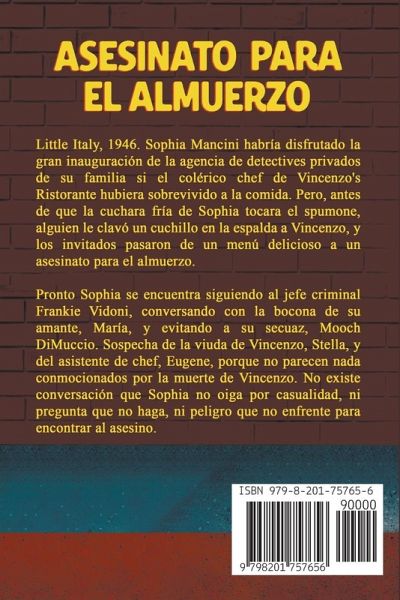 Little Italy, 1946. Sophia Mancini habría disfrutado la gran inauguración de la agencia de detectives privados de su familia si el colérico chef de Vincenzo's Ristorante hubiera sobrevivido a la comida. Pero, antes de que la cuchara fría de Sophia tocara el spumone, alguien le clavó un cuchillo en la espalda a Vincenzo, y los invitados pasaron de un menú delicioso a un asesinato para el almuerzo. Pronto Sophia se encuentra siguiendo al jefe criminal Frankie Vidoni, conversando con la bocona de su amante, María, y evitando a su secuaz, Mooch DiMuccio. Sospecha de la viuda de Vincenzo, Stella, y del asistente de chef, Eugene, porque no parecen nada conmocionados por la muerte de Vincenzo. No existe conversación que Sophia no oiga por casualidad, ni pregunta que no haga, ni peligro que no enfrente para encontrar al asesino.