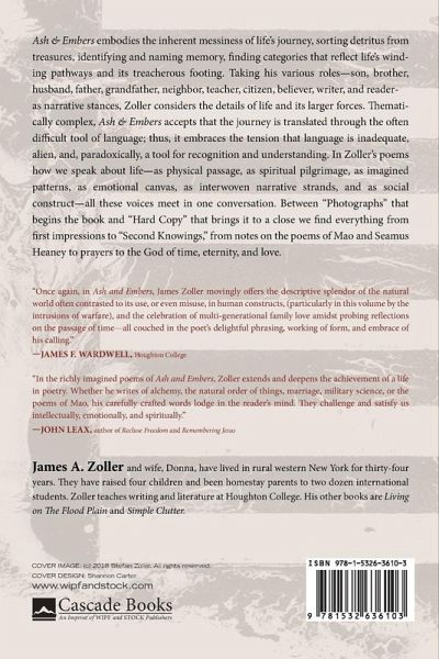 Ash & Embers embodies the inherent messiness of life's journey, sorting detritus from treasures, identifying and naming memory, finding categories that reflect life's winding pathways and its treacherous footing. Taking his various roles--son, brother, husband, father, grandfather, neighbor, teacher, citizen, believer, writer, and reader--as narrative stances, Zoller considers the details of life and its larger forces. Thematically complex, Ash & Embers accepts that the journey is translated through the often difficult tool of language; thus, it embraces the tension that language is inadequate, alien, and, paradoxically, a tool for recognition and understanding. In Zoller's poems how we speak about life--as physical passage, as spiritual pilgrimage, as imagined patterns, as emotional canvas, as interwoven narrative strands, and as social construct--all these voices meet in one conversation. Between "Photographs" that begins the book and "Hard Copy" that brings it to a close we find everything from first impressions to "Second Knowings," from notes on the poems of Mao and Seamus Heaney to prayers to the God of time, eternity, and love.