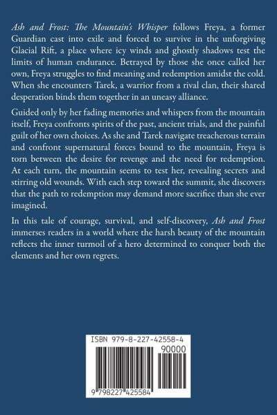 Ash and Frost: The Mountain's Whisper follows Freya, a former Guardian cast into exile and forced to survive in the unforgiving Glacial Rift, a place where icy winds and ghostly shadows test the limits of human endurance. Betrayed by those she once called her own, Freya struggles to find meaning and redemption amidst the cold. When she encounters Tarek, a warrior from a rival clan, their shared desperation binds them together in an uneasy alliance. Guided only by her fading memories and whispers from the mountain itself, Freya confronts spirits of the past, ancient trials, and the painful guilt of her own choices. As she and Tarek navigate treacherous terrain and confront supernatural forces bound to the mountain, Freya is torn between the desire for revenge and the need for redemption. At each turn, the mountain seems to test her, revealing secrets and stirring old wounds. With each step toward the summit, she discovers that the path to redemption may demand more sacrifice than she ever imagined. In this tale of courage, survival, and self-discovery, Ash and Frost immerses readers in a world where the harsh beauty of the mountain reflects the inner turmoil of a hero determined to conquer both the elements and her own regrets.