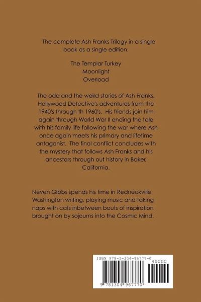 The complete Ash Franks Trilogy in a single book as a single edition: The Templar Turkey Moonlight Overload The odd and the weird stories of Ash Franks, Hollywood Detective's adventures from the 1940's through th 1960's. His friends join him again through World War II ending the tale with his family life following the war where Ash once again meets his primary and lifetime antagonist. The final conflict concludes with the mystery that follows Ash Franks and his ancestors through out history ending in Baker, California.
