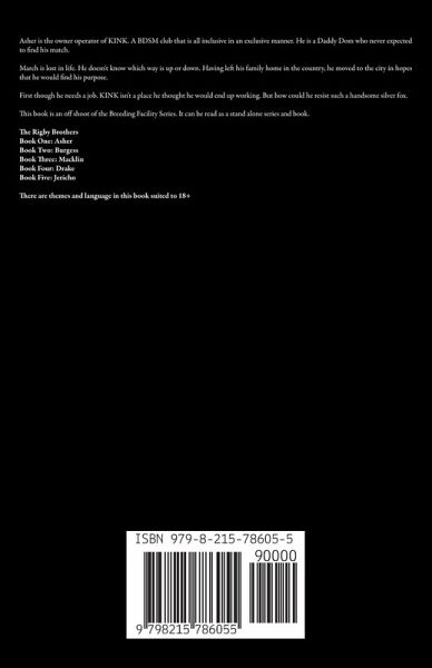 Asher is the owner operator of KINK. A BDSM club that is all inclusive in an exclusive manner. He is a Daddy Dom who never expected to find his match. March is lost in life. He doesn't know which way is up or down. Having left his family home in the country, he moved to the city in hopes that he would find his purpose. First though he needs a job. KINK isn't a place he thought he would end up working. But how could he resist such a handsome silver fox. This book is an off shoot of the Breeding Facility Series. It can be read as a stand alone series and book. The Rigby Brothers Book One: Asher Book Two: Burgess Book Three: Macklin Book Four: Drake Book Five: Jericho There are themes and language in this book suited to 18+