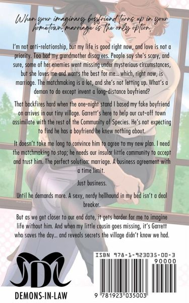 When your imaginary boyfriend turns up in your hometown, marriage is the only option. I'm not anti-relationship, but my life is good right now, and love is not a priority. Too bad my grandmother disagrees. People say she's scary, and sure, some of her enemies went missing under mysterious circumstances, but she loves me and wants the best for me... which, right now, is marriage. The matchmaking is a lot, and she's not letting up. What's a demon to do except invent a long-distance boyfriend? That backfires hard when the one-night stand I based my fake boyfriend on arrives in our tiny village. Garrett's here to help our cut-off town assimilate with the rest of the Community of Species. He's not expecting to find he has a boyfriend he knew nothing about. It doesn't take me long to convince him to agree to my new plan. I need the matchmaking to stop; he needs our insular little community to accept and trust him. The perfect solution: marriage. A business agreement with a time limit. Just business. Until he demands more. A sexy, nerdy hellhound in my bed isn't a deal breaker. But as we get closer to our end date, it gets harder for me to imagine life without him. And when my little cousin goes missing, it's Garrett who saves the day... and reveals secrets the village didn't know we had.