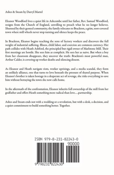 Ashes & Steam by Darryl Martel Eleanor Woodford lives a quiet life in Ashcombe until her father, Rev. Samuel Woodford, resigns from the Church of England, unwilling to preach what he no longer believes. Shunned by their genteel community, the family relocates to Brackton, a grim, soot-covered town where mill wheels never stop turning and silence keeps the peace. In Brackton, Eleanor begins teaching the sons of factory workers and discovers the full weight of industrial suffering. Illness, child labor, and coercion are common currency. Her path collides with Heath Ashford, the principled but rigid owner of Marlstone Mill. Their first meetings are hostile. She sees him as complicit. He sees her as naive. But when a boy from her classroom disappears, they uncover the truth: Brackton's most powerful man, Arthur Calder, is covering up worker deaths and silencing dissent. As Eleanor and Heath navigate riots, worker uprisings, and a media scandal, they form an unlikely alliance, one that turns to love beneath the pressure of shared purpose. When Eleanor's brother is taken hostage in a desperate act of revenge, she risks everything to save him without betraying the town she now calls home. In the aftermath of the confrontation, Eleanor inherits full ownership of the mill from her godfather and offers Heath something more radical than love.....partnership. Ashes and Steam ends not with a wedding or a revolution, but with a desk, a decision, and a quiet commitment to build something better. Together.
