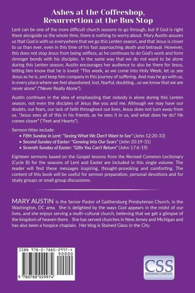 Lent can be one of the more difficult church seasons to go through, but if God is right there alongside us the whole time, there is nothing to worry about. Mary Austin assures us that God is with us everywhere that we go this Lenten season, and that Jesus is closer to us than ever, even in this time of his fast approaching death and betrayal. However, this does not stop Jesus from being selfless, as he continues to do God’s work and form stronger bonds with his disciples. In the same way that we do not want to be alone during this Lenten season, Austin encourages her audience to also be there for Jesus, letting him know that he is loved: "This week, as we come into Holy Week, let us see Jesus as he is, and keep him company in this journey of suffering. And may he go with us, in every place where we feel abandoned, lost, fearful, doubting…so we know that we are never alone" ("Never Really Alone"). Austin continues in the idea of emphasizing that nobody is alone during this Lenten season, not even the disciples of Jesus like you and me. Although we may have our doubts, our fears, our lack of faith throughout our lives, Jesus does not turn away from us. "Jesus sees all of this in his friends, as he sees it in us, and what does he do? He comes closer" ("Feet and Hearts"). Sermon titles include: Fifth Sunday in Lent: "Seeing What We Don’t Want to See" (John 12:20-33) Second Sunday of Easter: "Growing into Our Scars" (John 20:19-31) Seventh Sunday of Easter: "Gifts You Can’t Return" (John 17:6-19) Eighteen sermons based on the Gospel lessons from the Revised Common Lectionary (Cycle B) for the seasons of Lent and Easter are included in this single volume. The reader will find these messages inspiring, thought-provoking and comforting. The content of this book will be useful for personal devotions, for a study groups and for sermon preparation.