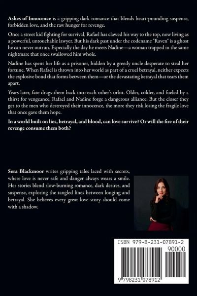 Ashes of Innocence is a gripping dark romance that blends heart-pounding suspense, forbidden love, and the raw hunger for revenge. Once a street kid fighting for survival, Rafael has clawed his way to the top, now living as a powerful, untouchable lawyer. But his dark past under the codename "Raven" is a ghost he can never outrun. Especially the day he meets Nadine-a woman trapped in the same nightmare that once swallowed him whole. Nadine has spent her life as a prisoner, hidden by a greedy uncle desperate to steal her fortune. When Rafael is thrown into her world as part of a cruel betrayal, neither expects the explosive bond that forms between them-or the devastating betrayal that tears them apart. Years later, fate drags them back into each other's orbit. Older, colder, and fueled by a thirst for vengeance, Rafael and Nadine forge a dangerous alliance. But the closer they get to the men who destroyed their innocence, the more they risk losing the fragile love that once gave them hope. In a world built on lies, betrayal, and blood, can love survive? Or will the fire of their revenge consume them both?