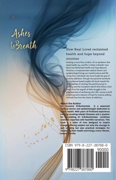Discover Ashes to Breath: How Real Lives Reclaimed Health and Hope Beyond Nicotine-a transformative guide by a leading medical doctor and epidemiologist that combines inspiring real-life stories of those who have quit smoking with practical, evidence-based tips and hacks to help you stop smoking for good. This powerful book showcases motivational testimonials that reveal the challenges and triumphs of breaking free from nicotine addiction, offering readers both hope and actionable strategies. Inside, you'll find: Real-Life Stories: Genuine, motivational accounts from individuals who have successfully overcome smoking addiction, designed to inspire and empower. Practical Tips and Hacks: Proven strategies and creative hacks to help manage cravings and transition to a smoke-free lifestyle. Chronological Benefits: An insightful section outlining the timeline of physical and mental health improvements that occur after quitting smoking. Whether you are looking for a fresh start for yourself or considering a life-saving gift for a loved one who smokes, Ashes to Breath offers both heartfelt inspiration and practical advice-the first step toward a healthier, smoke-free future. Embrace hope, reclaim your health, and ignite your journey to a vibrant life.