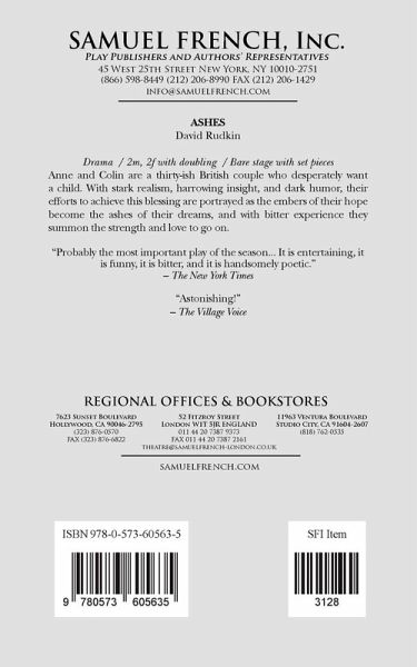 Drama Charcters: 2 male, 2 female w/doubling Bare stage with set pieces Anne and Colin are a thirty-ish British couple who desperately want a child. With stark realism, harrowing insight, and dark humor, their efforts to achieve this blessing are portrayed as the embers of their hope become the ashes of their dreams and with bitter experience they summon the strength and love to go on. "Probably the most important play of the season...It is entertaining, it is funny, it is bitter, and it is handsomely poetic."-The New York Times "Astonishing!"-The Village Voice