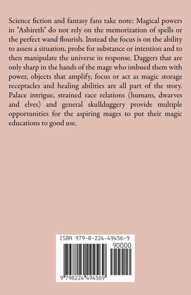 Science fiction and fantasy fans take note: Magical powers in "Ashireth" do not rely on the memorization of spells or the perfect wand flourish. Instead the focus is on the ability to assess a situation, probe for substance or intention and to then manipulate the universe in response. Daggers that are only sharp in the hands of the mage who imbued them with power, objects that amplify, focus or act as magic storage receptacles and healing abilities are all part of the story. Palace intrigue, strained race relations (humans, dwarves and elves) and general skullduggery provide multiple opportunities for the aspiring mages to put their magic educations to good use.