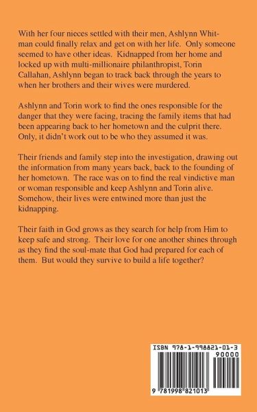 With her four nieces settled with their men, Ashlynn Whitman could finally relax and get on with her life. Only someone seemed to have other ideas. Kidnapped from her home and locked up with multi-millionaire philanthropist, Torin Callahan, Ashlynn began to track back through the years to when her brothers and their wives were murdered. Ashlynn and Torin work to find the ones responsible for the danger that they were facing, tracing the family items that had been appearing back to her hometown and the culprit there. Only, it didn't work out to be who they assumed it was. Their friends and family step into the investigation, drawing out the information from many years back, back to the founding of her hometown. The race was on to find the real vindictive man or woman responsible and keep Ashlynn and Torin alive. Somehow, their lives were entwined more than just the kidnapping. Their faith in God grows as they search for help from Him to keep safe and strong. Their love for one another shines through as they find the soul-mate that God had prepared for each of them. But would they survive to build a life together?