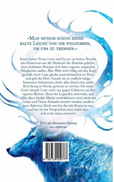 »Man müsste schon meine kalte Leiche von dir wegzerren, um uns zu trennen.« Kaum haben Trina, Liam und Fecyre im hohen Norden das Geheimnis um die Herkunft der Drachin gelüftet, muss Ashturias Königin sich ihren eigenen magischen Fähigkeiten stellen. Ihre Welt wird völlig auf den Kopf gestellt, doch Liam glaubt unerschütterlich an Trina und gibt ihr Halt. Gerade als sie endlich einige Antworten bekommen, droht alles durch eine uralte Bedrohung in Stücke gerissen zu werden. Für seine Liebe kämpft Liam nicht nur gegen Gefahren aus den eigenen Reihen. Denn die Legenden sind wahr, und sollte diese dunkle Macht zurückkehren, wird nicht nur Liams und Trinas Zukunft zerstört werden, sondern ganz Ashturia. Doch was hat das mit Fecyre zu tun, und was ist ein Versprechen wert, wenn man sich nicht daran erinnert? Teil 2 der Romantic-Fantasy aus Ashturia
