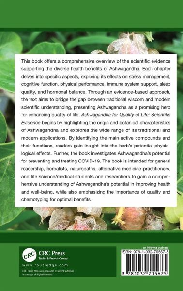 This book scientifically explores the health benefits of Ashwagandha for stress management, cognitive function, immunity, sleep quality, and hormonal balance. This book is intended for general readership, herbalists, naturopaths, alternative medicine practitioners and lifescience/medical students and researchers.