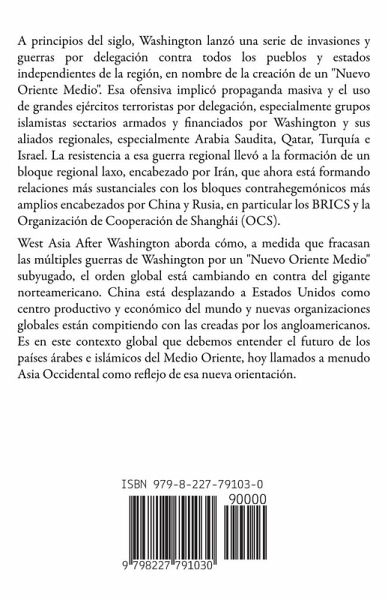 A principios del siglo, Washington lanzó una serie de invasiones y guerras por delegación contra todos los pueblos y estados independientes de la región, en nombre de la creación de un "Nuevo Oriente Medio". Esa ofensiva implicó propaganda masiva y el uso de grandes ejércitos terroristas por delegación, especialmente grupos islamistas sectarios armados y financiados por Washington y sus aliados regionales, especialmente Arabia Saudita, Qatar, Turquía e Israel. La resistencia a esa guerra regional llevó a la formación de un bloque regional laxo, encabezado por Irán, que ahora está formando relaciones más sustanciales con los bloques contrahegemónicos más amplios encabezados por China y Rusia, en particular los BRICS y la Organización de Cooperación de Shanghái (OCS). West Asia After Washington aborda cómo, a medida que fracasan las múltiples guerras de Washington por un "Nuevo Oriente Medio" subyugado, el orden global está cambiando en contra del gigante norteamericano. China está desplazando a Estados Unidos como centro productivo y económico del mundo y nuevas organizaciones globales están compitiendo con las creadas por los angloamericanos. Es en este contexto global que debemos entender el futuro de los países árabes e islámicos del Medio Oriente, hoy llamados a menudo Asia Occidental como reflejo de esa nueva orientación.