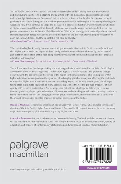 PART I: CHANGING DYNAMICS OF ASIA PACIFIC GRADUATE EDUCATION.- 1.Novel Forms of Financing Cross-Border Graduate Education; Chris Ziguras.-2.Graduate Education in Asia Pacific Higher Education: Changing Roles and Purposes; Edilberto C. de Jesus.- 3.Graduate Degrees in the Emergent Political Economy of Contemporary Globalization; Deane Neubauer.- PART II: GRADUATE EDUCATION IN COMPARATIVE COUNTRY SETTINGS.-4.An Examination of Employment Outcomes for Graduate Education at the University of Hawaii; Pearl Imada Iboshi, Ming Zhang, Sanford Beppu, and Winnie Wu.- 5.The Postgraduate Research Student Experience in Malaysia; Koo Yew Lie and Vincent Pang.-6.Learning Outcomes Assessment in Graduate Education: A Comparative Overview between United States and ASEAN; Stewart Sutin and Somkiat Kamolpun.-7.Challenges and Strategic Development of PhD Education of Fu Jen Catholic University; Shang-Shing P. Chou, Chih-Hsien Yang, and Gregory S. Ching.-8.Improving the Quality ofContemporary Graduate Education: a Proposal for Nurturing Future Civic-Minded Professionals; Farrah Dina Yusop.-9.Industry-Oriented Graduate Programs in Thailand: A Review; Bundit Fungtammasan.-10."Diploma Disease" in Thai Higher Education; Prompilai Buasuwan and Michael Jones.-11.Exploring Researcher Motivation: Implications for PhD Education; Robyn Barnacle, Denise Cuthbert, and Richard Laurie.- 12.Conclusion; Deane Neubauer and Prompilai Buasuwan.