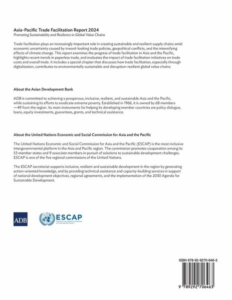 This report examines the progress of trade facilitation in Asia and the Pacific, highlights recent trends in paperless trade, and evaluates the impact of trade facilitation initiatives on trade costs and overall trade. Trade facilitation plays an increasingly important role in creating sustainable and resilient supply chains amid economic uncertainty caused by inward-looking trade policies, geopolitical conflicts, and the intensifying effects of climate change. The report includes a special chapter that discusses how trade facilitation, especially through digitalization, contributes to environmentally sustainable and disruption-resilient global value chains.