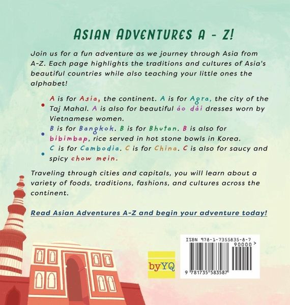 Can you name the Asian cities, food, holidays, and others from A-Z? Join us for a fun adventure as we journey through Asia from A-Z. Each page highlights the traditions and cultures of Asia's beautiful countries while also teaching your little ones the alphabet!A is for Asia, the continent. A is for Agra, the city of the Taj Mahal. A is also for beautiful áo dài dresses worn by Vietnamese women. B is for Bangkok. B is for Bhutan. B is also for bibimbap, rice served in hot stone bowls in Korea. C is for Cambodia. C is for China. C is also for saucy and spicy chow mein. Traveling through cities and capitals, you will learn about a variety of foods, traditions, fashions, and cultures across the continent. Read Asian Adventures A-Z and begin your adventure today!