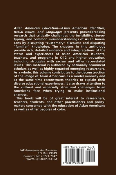 A volume in Research on the Education of Asian Pacific Americans Series Editors Clara C. Park, California State University, Northridge, Russell Endo, University of Colorado, and Xue Lan Rong, University of North Carolina, Chapel Hill (Sponsored by SIG-Research on the Education of Asian and Pacific Americans of the American Educational Research Association and National Association for Asian and Pacific American Education) Asian American Education--Asian American Identities, Racial Issues, and Languages presents groundbreaking research that critically challenges the invisibility, stereotyping, and common misunderstandings of Asian Americans by disrupting "customary" discourse and disputing "familiar" knowledge. The chapters in this anthology provide rich, detailed evidence and interpretations of the status and experiences of Asian American students, teachers, and programs in K-12 and higher education, including struggles with racism and other race-related issues. This material is authored by nationally-prominent scholars as well as highly-regarded emerging researchers. As a whole, this volume contributes to the deconstruction of the image of Asian Americans as a model minority and at the same time reconstructs theories to explain their diverse educational experiences. It also draws attention to the cultural and especially structural challenges Asian Americans face when trying to make institutional changes. This book will be of great interest to researchers, teachers, students, and other practitioners and policymakers concerned with the education of Asian Americans as well as other peoples of color.