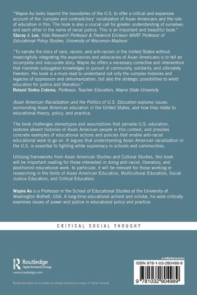 Utilizing frameworks from Asian American Studies and Cultural Studies, this book will be important reading for those interested in doing anti-racist, liberatory, and abolitionist educational work. In particular, it will be relevant for those working or researching in the fields of Asian American Education, Multicultural Education, Social Justice Education, and Critical Education.