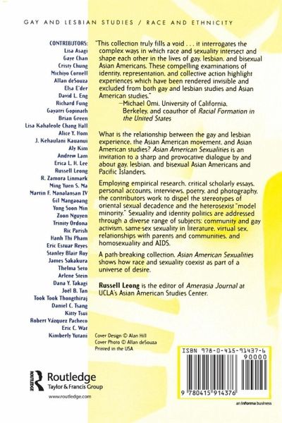 Asian American Sexualities works to dispel the stereotype of oriental sexual decadence, as well as the "model minority" heterosexual Asian sterotype in the US. Writing from an impressive array of interdisciplinary perspectives, the contributors discuss a variety of topics, including sexuality and identity politics; community activism and gay activism; transnational aspects of love between women in Thailand; queer South Asian culture in the US; gay and lesbian filmmakers; same-sex sexuality in Pacific literature; and Asian American male homosexuality and AIDS. The relationship of the gay and lesbian experience to Asian American studies and Ethnic Studies is also explored.