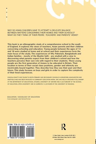This book is an ethnographic study of a comprehensive school in the south of England. It explores the views of teachers, Asian parents and their children concerning education and schooling. Young people between the ages of 13 and 18 were studied at home and at school and their experiences form the main focus of the study. The experiences of fifty Pakistani, Bangladeshi and Indian families - mostly of Muslim faith - are studied with a view to discovering what parents expect from their children's school and how the teachers perceive their own role with regard to their students. These young people are the first generation of Asians to be educated in Britain. Their location in terms of their social class positions, gender and ethnicity are inextricably bound together. They describe how they see their past and their future. This is the first study to take account of boys and girls in order to capture the complexity of their lived experiences.