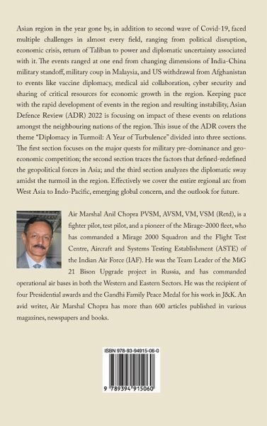 Asian region in the year gone by, in addition to second wave of Covid-19, faced multiple challenges in almost every field, ranging from political disruption, economic crisis, return of Taliban to power and diplomatic uncertainty associated with it. The events ranged at one end from changing dimensions of India-China military standoff, military coup in Malaysia, and US withdrawal from Afghanistan to events like vaccine diplomacy, medical aid collaboration, cyber security and sharing of critical resources for economic growth in the region. Keeping pace with the rapid development of events in the region and resulting instability, Asian Defence Review (ADR) 2022 is focusing on impact of these events on relations amongst the neighbouring nations of the region. This issue of the ADR covers the theme "Diplomacy in Turmoil: A Year of Turbulence" divided into three sections. The first section focuses on the major quests for military pre-dominance and geo-economic competition; the second section traces the factors that defined-redefined the geopolitical forces in Asia; and the third section analyzes the diplomatic sway amidst the turmoil in the region. Effectively we cover the entire regional arc from West Asia to Indo-Pacific, emerging global concern, and the outlook for future. Air Marshal Anil Chopra PVSM, AVSM, VM, VSM (Retd), is a fighter pilot, test pilot, and a pioneer of the Mirage-2000 fleet, who has commanded a Mirage 2000 Squadron and the Flight Test Centre, Aircraft and Systems Testing Establishment (ASTE) of the Indian Air Force (IAF). He was the Team Leader of the MiG 21 Bison Upgrade project in Russia, and has commanded operational air bases in both the Western and Eastern Sectors. He was the recipient of four Presidential awards and the Gandhi Family Peace Medal for his work in J&K.