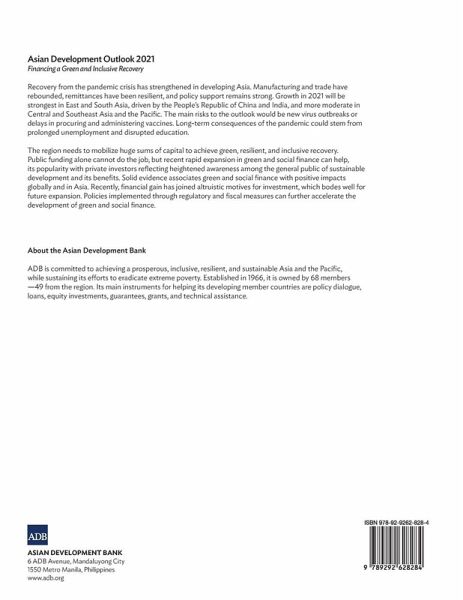 This report presents economic prospects for developing Asia and the Pacific. It includes analysis of the impacts of school closures caused by the pandemic and a theme chapter on financing a green and inclusive recovery. The theme chapter on financing a green and inclusive recovery explores the drivers and impacts of green and social finance and its prospects in the region. Recently, financial gain has joined altruistic motives for investment, which bodes well for future expansion. Policies implemented through regulatory and fiscal measures can further accelerate the development of green and social finance.